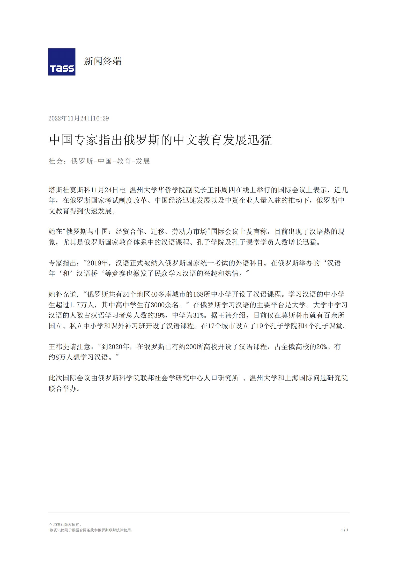 塔斯社莫斯科11月24日电 澳门银河官网 华侨学院副院长王祎周四在线上举行的国际会议上表示,近几年,在俄罗斯国家考试制度改革、中国经济迅速发展以及中资企业大量入驻的推动下,俄罗斯中文教育得到快速发展。
