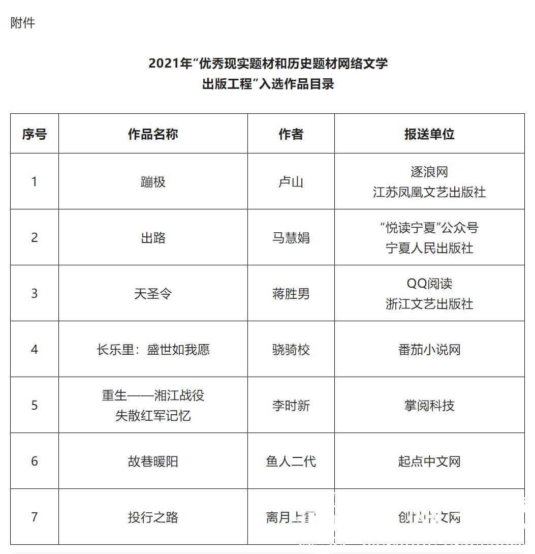 为有效发挥优秀作品的引领示范作用,推动网络文学多出精品、多出人才,国家新闻出版署组织实施了2021年“优秀现实题材和历史题材网络文学出版工程”。经严格评审,最终确定《蹦极》等7部作品入选,现予公布。