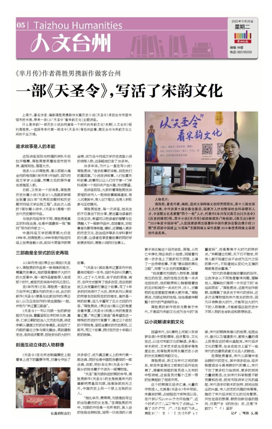 上周六,著名作家、编剧蒋胜男携新作长篇历史小说《天圣令》来到台州市图书馆市民书房,带来一场《从“天圣令”看宋韵文化》主题讲座。