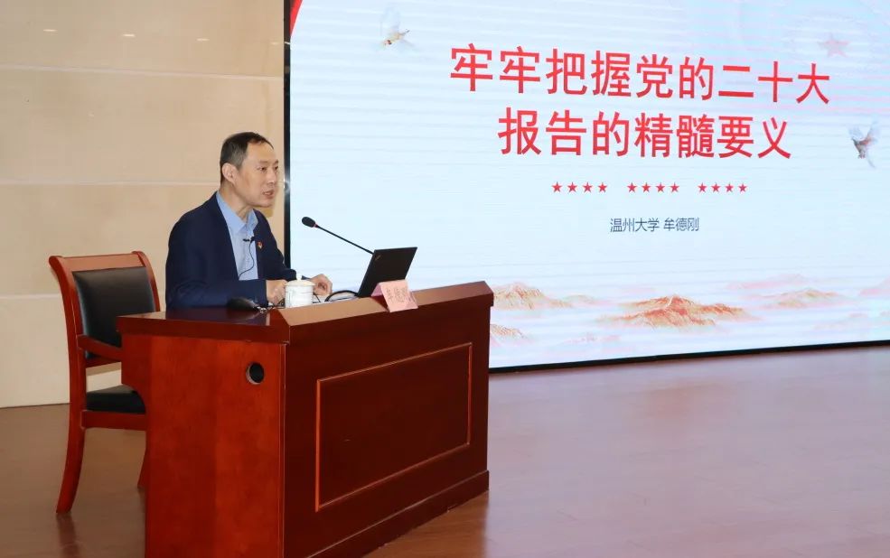 接着,牟德刚教授从牢牢把握过去5年工作和新时代10年伟大变革的重大意义、牢牢把握习近平新时代中国特色社会主义思想的世界观和方法论、牢牢把握以中国式现代化推进中华民族伟大复兴的使命任务、牢牢把握以伟大自我革命引领伟大社会革命的重要要求、牢牢把握团结奋斗的时代要求等5个方面,联系温州实际,对党的二十大报告作了条理清晰、深入浅出的讲解,畅谈自己的学习体会感悟。