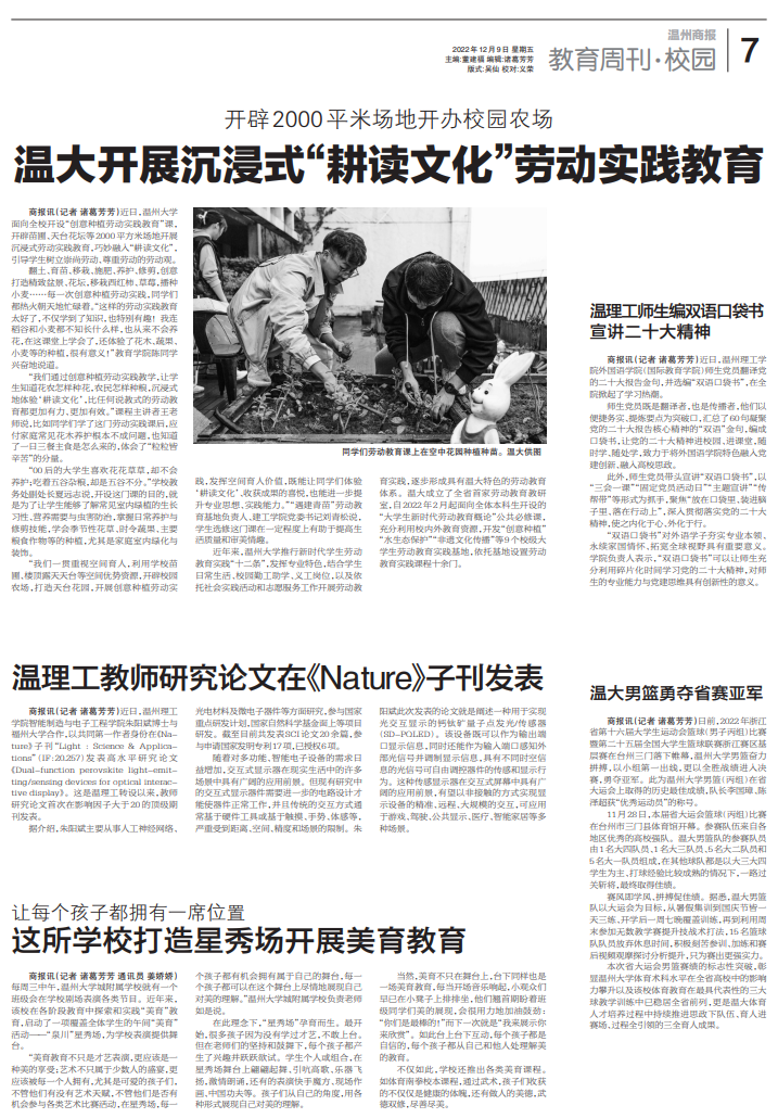 翻土、育苗、移栽、施肥、养护、修剪,创意打造精致盆景、花坛,移栽西红柿、草莓,播种小麦……每一次创意种植劳动实践,同学们都热火朝天地忙碌着。“这样的劳动实践教育太好了,不仅学到了知识,也特别有趣!我连稻谷和小麦都不知长什么样,也从来不会养花,在这课堂上学会了,还体验了花木、蔬果、小麦等的种植,很有意义!”教育学院陈同学兴奋地说道。