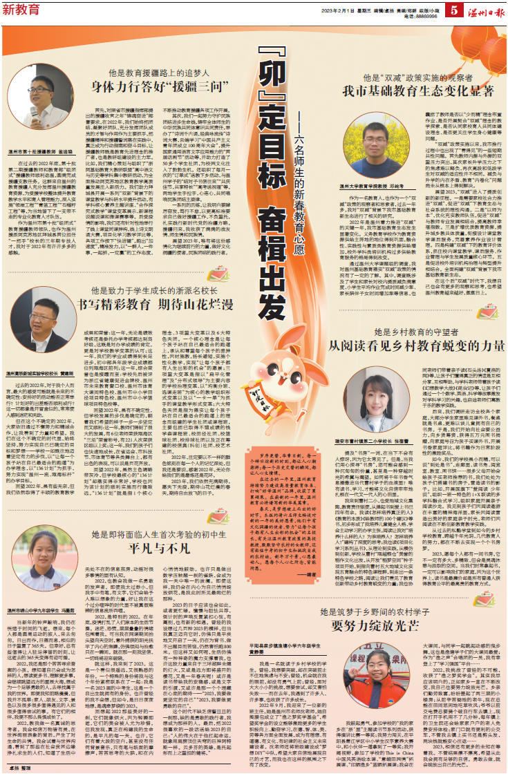 春天,是梦想破土而出的好时节。本版约请六名师生畅谈对新的一年的美好愿景,他们中有文化润疆的使者、努力“让每个孩子都有人生出彩的机会”的名校长,有关注温州教育政策的高校教授、默默坚守农村的女教师,还有面临中考的初中生和挑战自我的农村娃。新年万千景,心愿最动人。愿每个人心之所念,皆能所愿。