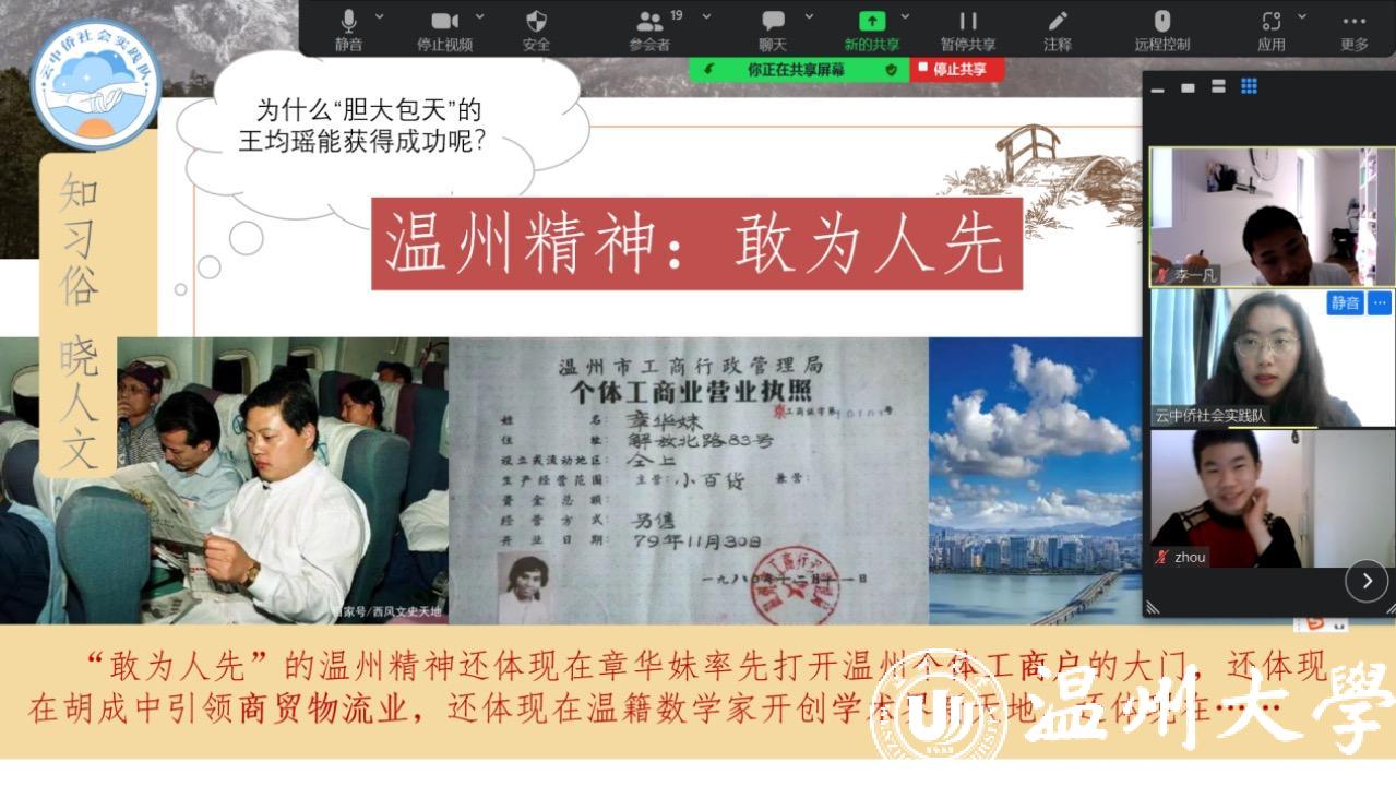 本次课程以《溯中国源,筑华夏梦——中华寻根之旅》为主题,分为“走进国旗”“中国历史传声筒”“祖国的发展与未来”三部分。在《云游温州》一课中,实践队成员围绕“观景点”“探美食”“知习俗”“晓人文”四大主题,通过一系列的风景图、美食照、传统节日剪影、温州精神阐释,带领海外侨童云端游历温润之州的美景美食、风俗人文,帮助孩子们更加立体全面地了解温州。