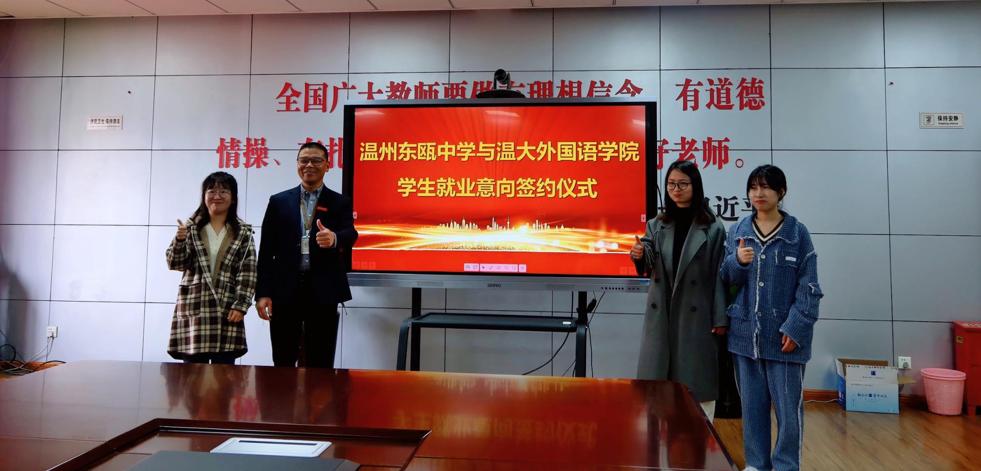 为进一步推进2023届高校毕业生春季促就业攻坚行动,助力毕业生高质量、精准就业,日前,澳门银河官网 外国语学院院长叶苗带队走访温州东瓯中学,开展“访企拓岗促就业”活动,助力三名毕业生当场签订就业意向协议书。