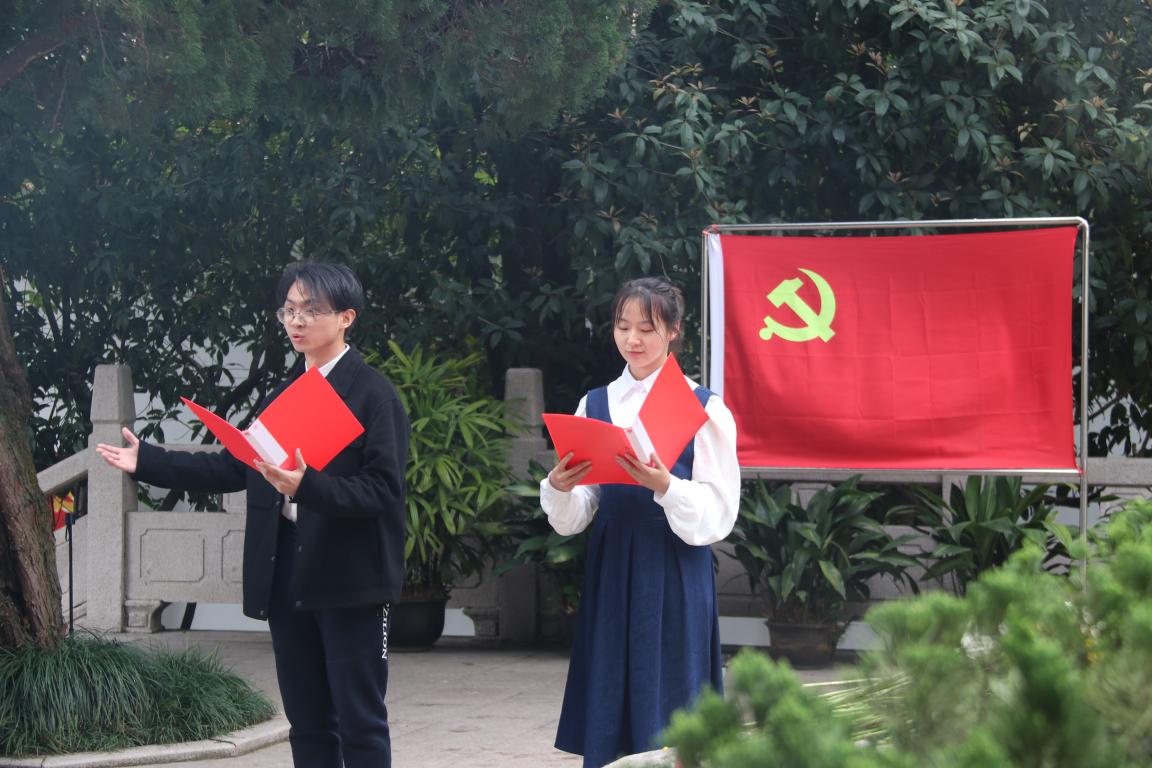 缅怀活动在嘹亮的《义勇军进行曲》中拉开序幕,全体人员肃立,默哀,向革命烈士纪念碑敬献花篮,深切缅怀革命先烈。“我22岁,都说这是一辈子最好的年纪……”“对,我22岁,我们之间相隔了75年……”来自银河 外院21英语(师范)班的蔡依睿、周栋杰两位同学深情表演诗朗诵《我们的青春》,一段穿越时空的对话,生动表达了对革命先烈为民族、为国家不惜牺牲的大无畏英雄气概和顽强拼搏精神的深深敬意。