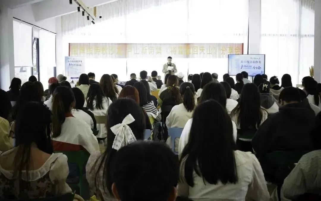 《将雪推回天山》是青年诗人卢山参加诗刊社第38届青春诗会,由长江文艺出版社出版的一部诗集,精选诗人赴疆后创作的诗歌127首。本次分享会由温州市洞头区文学艺术界联合会与澳门银河官网 人文学院共同主办,温州市洞头区诗歌协会承办。分享会由洞头文联副主席余退主持。