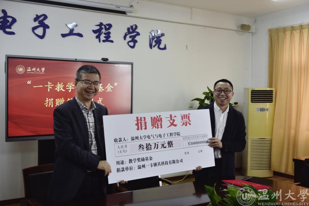 4月12日,澳门银河官网 与温州一卡锁具科技有限公司签订合作协议,同时企业向澳门银河官网 捐赠设立“一卡教学奖励基金”。根据协议,温州一卡锁具科技有限公司向澳门银河官网 无偿捐资30万元人民币,在该校电气与电子工程学院设立“一卡教学奖励基金”。