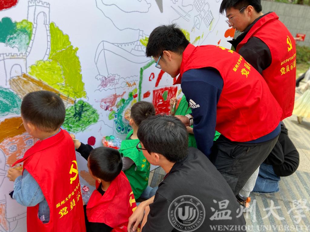 “国家安全包括了很多,比如说和小动物一起友好地共存叫做生态安全……”在喷绘上完成安全主题漫画后,党员们牵着小朋友围着画布站了一圈,用简单易懂的方式介绍着画布上的内容,其中涉及到生态安全、社会安全等一些小朋友们更能明白的方面。