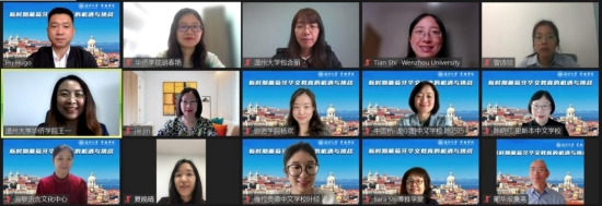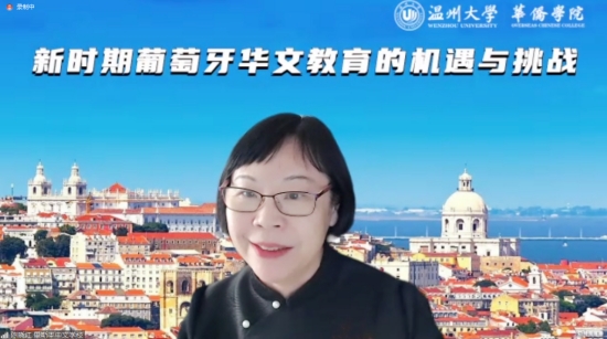 2023年4月27日下午,由澳门银河官网 华侨学院主办,浙江华侨网络学院、欧洲华文教育研究所承办,葡萄牙淑敏语言文化中心、里斯本中文学堂、博雅学堂、欧诺学院、中国桥波尔图中文澳门银河官网 、维拉贡德中文澳门银河官网 协办的“新时期葡萄牙华文教育的机遇与挑战”线上研讨会成功举办。中国驻葡萄牙使馆领侨处主任夏晚晴,葡萄牙华侨华人总会常务副会长胡胜武,里斯本中文澳门银河官网 负责人陈晓红,淑敏语言文化中心负责人韩淑敏,维拉贡德中文澳门银河官网 教师叶经,博雅学堂负责人石咏雪,欧诺学院负责人杨欢,中国桥波尔图中文澳门银河官网 负责人陈巧巧,葡萄牙阿尔马达市卡西利亚什特茹中学教师吴玉荣,葡华报社集团总裁詹亮,葡新报记者杨迪,主办方澳门银河官网 华侨学院院长包含丽、副教授胡春艳以及华侨学院教职工参加本次会议。