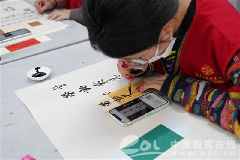 活动前期,同学们汇聚在学院教室里,由扎染的同学做好蓝染纸扇的扇面,接着书法专业的同学在晾干的蓝染纸扇和古风书签上书写“劳动最光荣、致敬……”等字样,再传给擅长绘画的同学泼墨挥毫,以流水线合作的形式创作出精美的墨香作品,一笔一划都包含了同学们对劳动者的感激与敬佩。