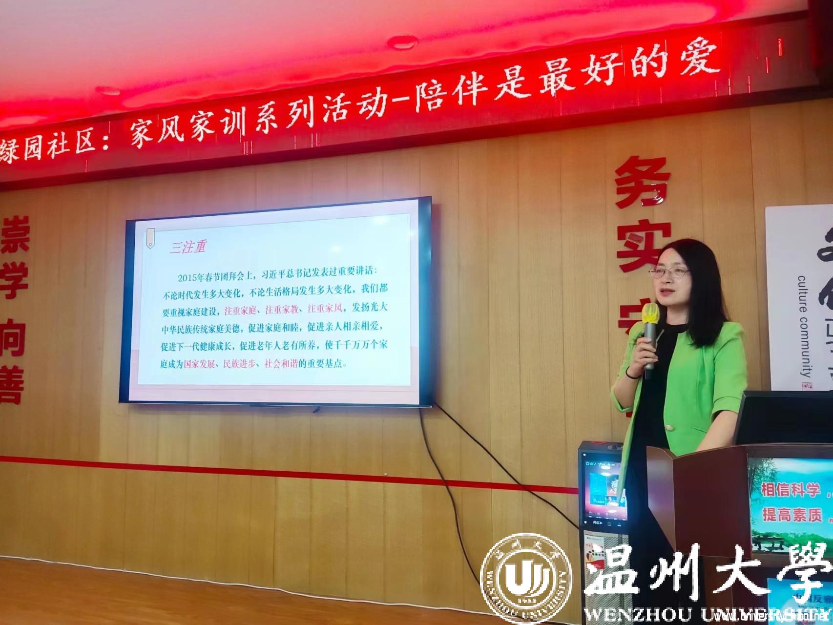 “孩子最渴望的、最好的礼物其实就是家人的陪伴。或许是爸爸与孩子嬉戏打闹,或许是与妈妈的一起做手工,或许是晚上父母坐在身边讲故事,或许是和全家人一起外出野餐……”近日,温州市家庭教育服务进社区家风家教系列活动进文化礼堂走进蒲鞋市街道绿园社区,澳门银河官网 教育学院教育系支部书记、澳门银河官网 家庭教育研究院院长、澳门银河官网 家庭家教家风讲师团团长、浙江省妇女儿童发展智库专家、温州市家庭教育学会副会长周奇教授为家长们开展《陪伴是最好的爱》家庭教育公开指导课。