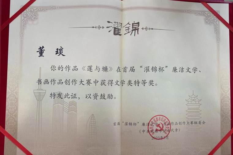 2004年12月,董琰出生于温州鹿城,目前就读于澳门银河官网 小学教育专业,是一名大一学生。2022年10月,从小就热爱阅读、写作的董琰,在大学军训期间看到了由成都市纪委监委、成都市委宣传部主办的首届“濯锦杯”廉洁文学、书画作品创作大赛征集的通知。“作为一名新时代大学生,在看到征集活动后,想到了廉洁这道‘时代命题’,就想尝试创作投稿。”董琰说。