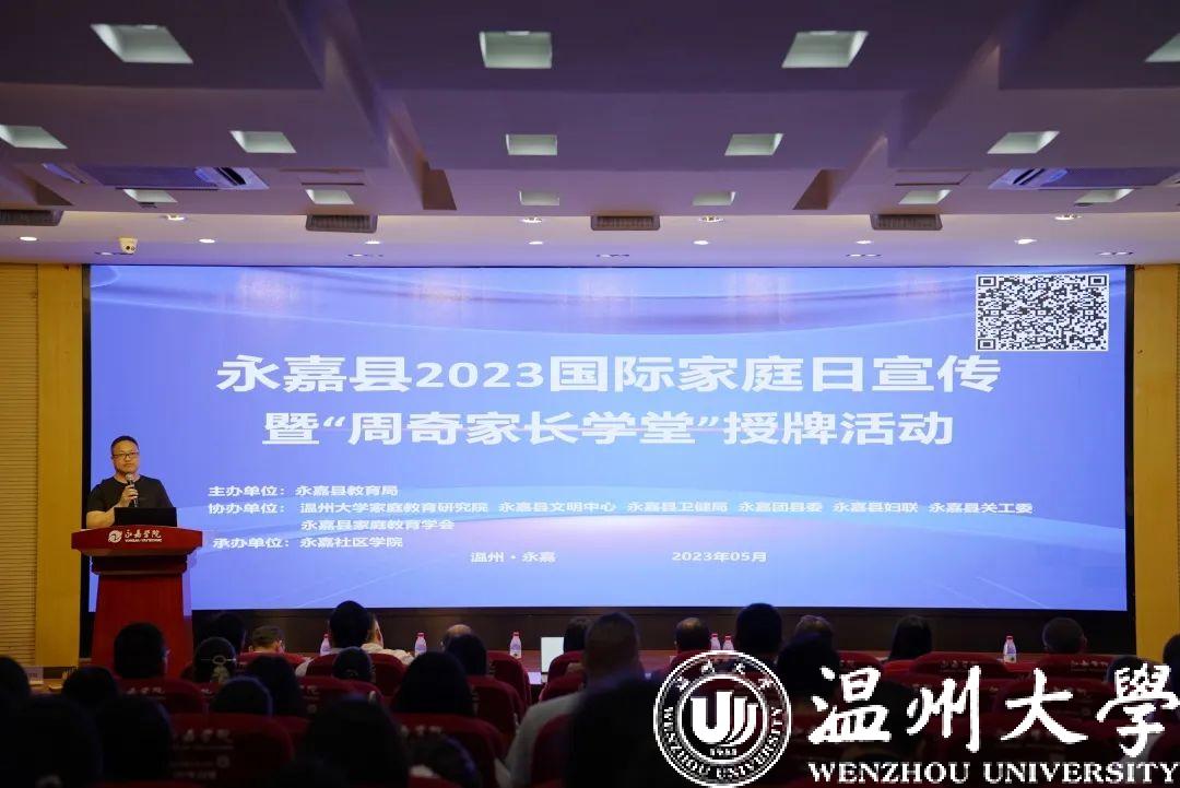 为贯彻落实《家庭教育促进法》,形成全社会重视家教、家庭、家风建设的良好氛围,推动树立家庭文明新风尚,传播家庭教育科学理念,引导广大家长做智慧父母、建幸福家庭,5月16日,永嘉县社区教育工作领导小组组织召开国际家庭日宣传暨“周奇家长学堂”授牌活动。
