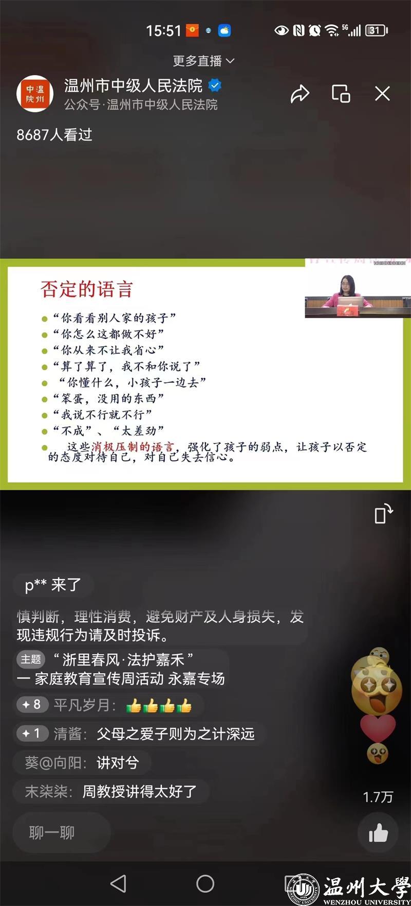 在讲座中,周教授着重指出《家庭教育促进法》法中的第二条、第八条、第十七条,意在通过法律的讲解明确家长的责任,强调在家庭教育中父母需要潜移默化,言传与身教相结合;严慈相济,关心爱护与严格要求并重。周教授在她的讲座中以其幽默风趣的语言讲述了身边的真实的案例,让观看直播的观众内心产生强烈共鸣,真切体会到“父母是孩子的第一任老师,也是终身的老师”,让观众明白自身榜样示范的重要性,深刻诠释了好家风是最好的教养。