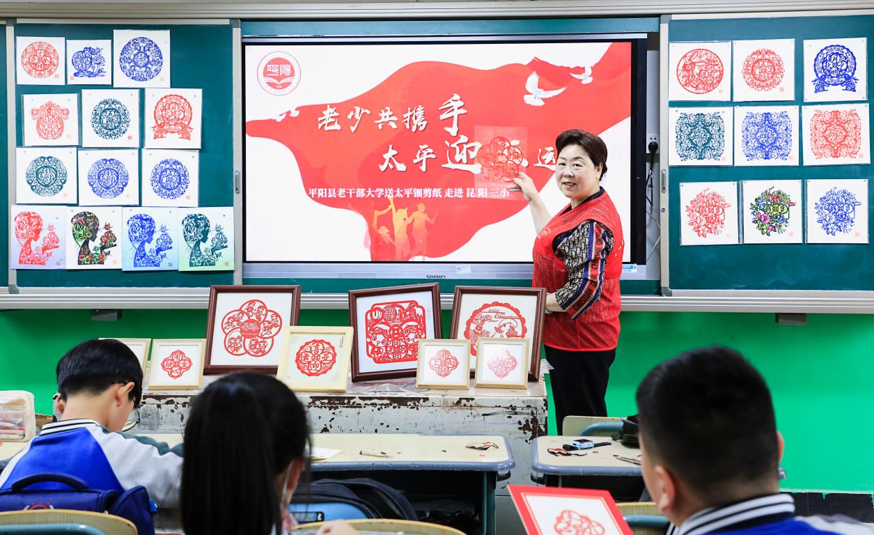“六一”儿童节来临之际,日前,平阳县老干部大学太平钿剪纸班分别走进昆阳镇新城小学和昆阳镇第三小学,开展了两场“老少共携手·太平迎亚运”太平钿剪纸进校园志愿活动。红都晚晴志愿者们将亚运元素与省级非物质文化遗产“平阳太平钿剪纸”相结合,为学生们带去别出心裁的“喜迎亚运”实践课程,也提前为孩子们送上节日问候。这群志愿者爷爷奶奶中就有澳门银河官网 退休干部、离退休第八党支部书记、离退休教职工协会平阳分会理事瞿亚平。