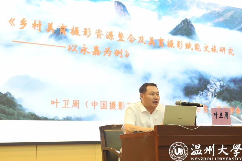 永嘉县社科联叶卫周主席以《乡村美育摄影资源整合及美育摄影赋能文旅研究——以永嘉为例》做交流分享报告,探讨如何开展温州永嘉摄影美育资源探索,如何打造永嘉美育摄影采风路线和培训基地等,为推动永嘉文旅融合、乡村振兴和共同富裕发展,发挥美育摄影的提升作用。叶卫周主席作为2021年在永嘉召开的“中国青少年摄影美育论坛可行性研讨会”的重要参会者,曾建议要抓住当前全国大力倡导美育教育的大背景下,整合各方面,参与摄影美育建设,要把握摄影美育为社会服务和为学生服务的主线,积极吸收摄影美育工作者,重视树立摄影美育品牌,可积极打造中国青少年摄影美育论坛,组织师生参与摄影互动、参赛、联展和论坛等活动。