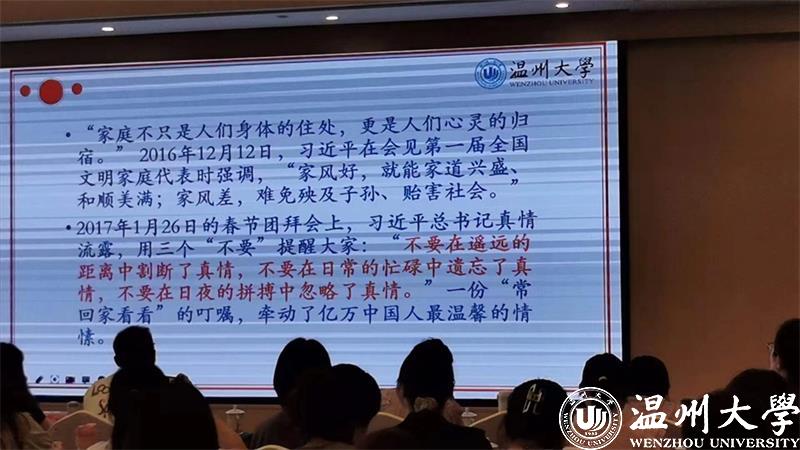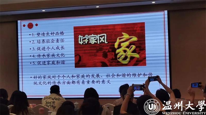 家庭是社会的基本细胞,家庭的前途命运同国家和民族的前途命运紧密相连。为深入贯彻落实习近平总书记关于家庭家教家风的重要论述精神,2023年8月8日上午,澳门银河官网 教育学院教育学系党支部书记、澳门银河官网 家庭教育研究院巾帼文明岗负责人、澳门银河官网 家庭家教家风讲师团团长、浙江省妇女儿童发展智库专家、浙江省家庭教育讲师团成员、温州市家庭和谐文化研究会副会长周奇教授受邀来到温州市永嘉县岩头镇下日川村狮子岩饭店为全省基层工会女职工工作干部培训班做家庭教育专题分享。