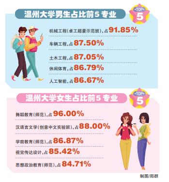 今秋,温医大将迎来4080名本科新生,他们来自全国31个省、自治区、直辖市、特别行政区。男女比例与往年相近,依旧是四六开,其中,男生1747人,占42.82%,女生2333人,占57.18%。但是,不同专业的男女比例非常悬殊。该校护理学专业女生472人,男生则只有149人;临床医学男生271人,女生215人。