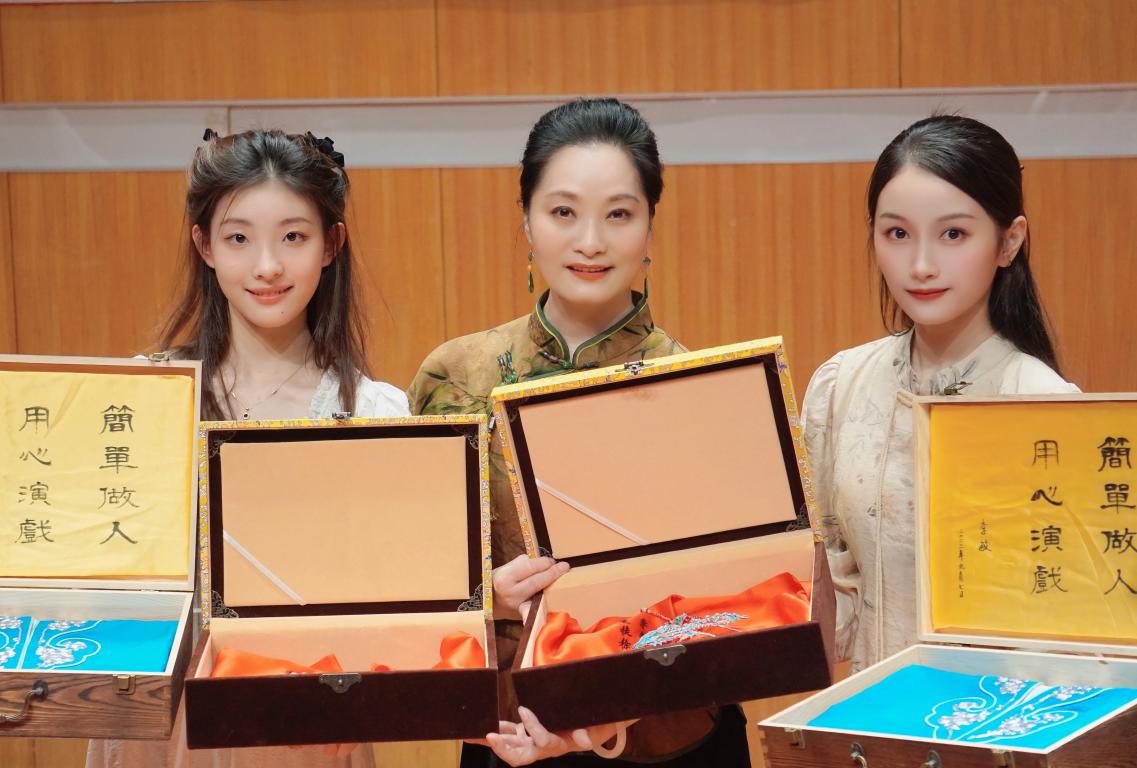 当天的拜师环节仪式感满满,徒弟鞠躬、屈膝献茶、奉拜师礼,李敏在接过献花时和徒弟拥抱,回赠礼物。她为每位爱徒准备了两份礼物,一份是特意请苏州老师傅缝制的水袖,她希望徒弟能每天练好基本功,“曲不离口、拳不离手”。另一份则是旦角头饰“点翠凤”,她祝福徒弟的演艺生涯能如“百鸟朝凤”般精彩纷呈。拜师回礼被安放在精美的礼盒中,盒内的绸缎还专门绣了学生的名字。