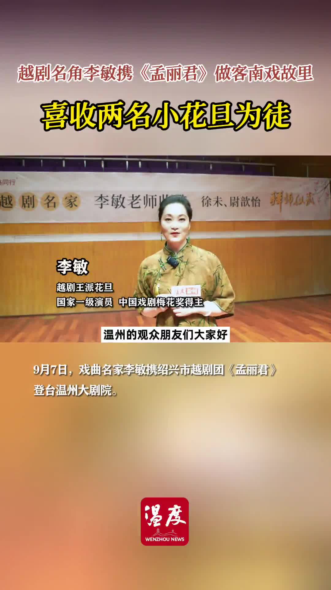 演出结束后,在近千名现场观众的欢呼声中,李敏和黄燕舞返场并隆重介绍两位新人徐未、尉歆怡。李敏携两位在温刚收的爱徒,为观众献上师徒“首秀”。在教师节来临前夕,温州戏曲圈再添一段佳话,再续王派薪火传承。