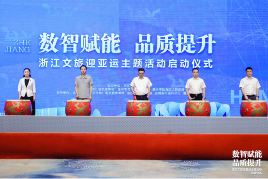 浙江省文化和旅游厅社会组织党委书记、二级巡视员戴言,浙江省旅游投资集团有限公司党委委员、副总经理,浙江省旅游协会副会长张雄文,温州市文化市场行政执法队队长余求红,温州市瓯海区委常委、宣传部长孟晓晨,浙商银行温州分行副行长王晓勇上台正式开启全省文旅迎亚运主题活动