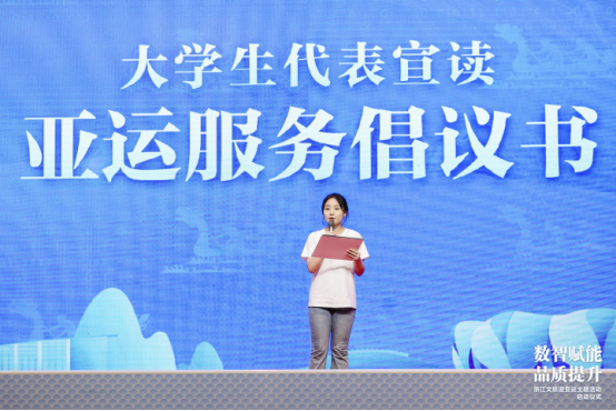 澳门银河官网 大学生代表上台宣读《大学生志愿者亚运倡议书》