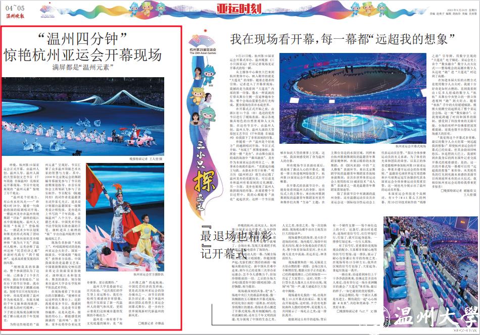 在现场观看了节目演 出的吕颖璐说:“能够在亚 运这样的大舞台上,近距 离观看家乡节目,我感到 非常激动。无论是节目整 体编排,还是从道具、服 装的用心上,都能感受到 满满的‘温州味’。接下 来,家乡还将举办亚运龙 舟赛事,更让我期待。”