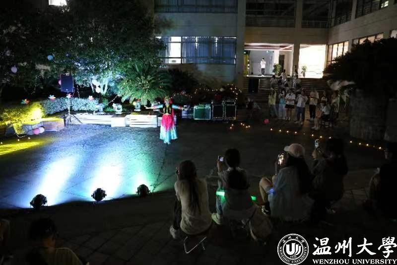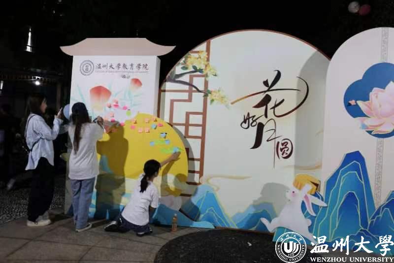活动现场摆放主题喷绘、“创意签到区”和“中秋祝福墙”,在浓浓的节日氛围中,同学们积极地写下自己极富温情的心愿和祝福。学院中庭设有舞台,打卡区,手工互动区和展示区等多个各具特色的区域,打造别具一格的国风中秋游园会,体现了中华文化的别样魅力。教育学院因地制宜将现有的开放式场地和木凳子装饰成“露天舞台”,同学们在欣赏美妙歌舞的同时,沉浸于制作专属冰皮月饼和花灯以及猜灯谜、投壶等等极富节日氛围的活动和游戏,感受指尖上的文化艺术传承,体会代代相传中不变的中秋佳节的独特魅力。