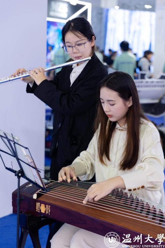 美术与设计学院的“数智”融创系列艺术设计作品。作品通过运用数字化工具和技术,将传统的时尚设计与现代科技相结合,呈现出独特而富有创意的艺术形式,为观众带来了全新的视觉和感官体验。现场还有来自音乐学院的学生们为市民带来乐器演奏,来自校团委的志愿者讲解员热情地为市民介绍各项目特色,展现出银河 青年风采。