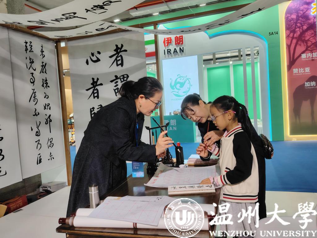 “书房门前一枝梅,树上鸟儿对打对。”泰顺展区门口传来阵阵越剧声,两位泰顺提线木偶戏艺术家正提着木偶,表演着《梁山伯与祝英台》中的《十八相送》曲目,还操纵着木偶时不时与围观的小朋友来个互动。在龙湾展区,“赏国学”区的书法桌上摆放着文房四宝,有专门的书法老师指导小朋友们握笔、写字,工作人员说,今天目前开馆不久,已经有十几个小朋友来体验了书法了。