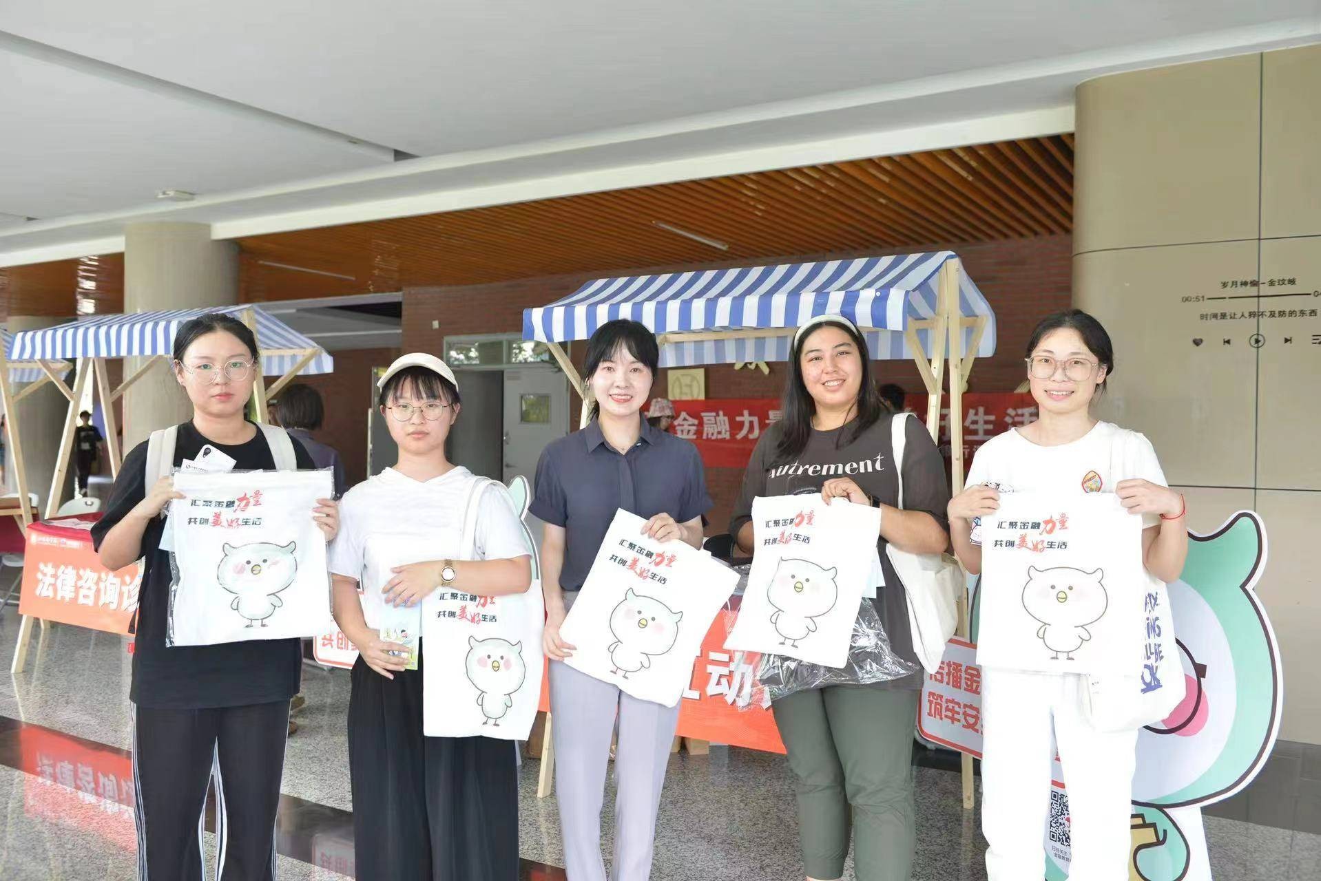 活动现场,还设置“招小宝”金融教育卡通立牌,可爱的卡通造型以及醒目的风险提示语句让过往学生纷纷驻足拍照,同时学生可以通过扫“招小宝”二维码关注招行金融教育视频号,线上学习更多金融知识。同时,为鼓励学生积极了解宣传金融知识,特别定制了“汇聚金融力量 共创美好生活”主题环保袋,希望通过学生自身力量加大金融风险防范知识在学生中的普及。