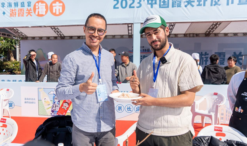 2023中国霞关虾皮节暨首届海鲜狂欢厨王争霸赛活动首日,沿着海边栈道摆设建立而成,集海鲜市场、地方特产、手作文创、特色小吃等为一体的千米市集,让Rida(瑞达)和marouane(马大伟)两位国际友人体验了一把“逛大集”的乐趣。