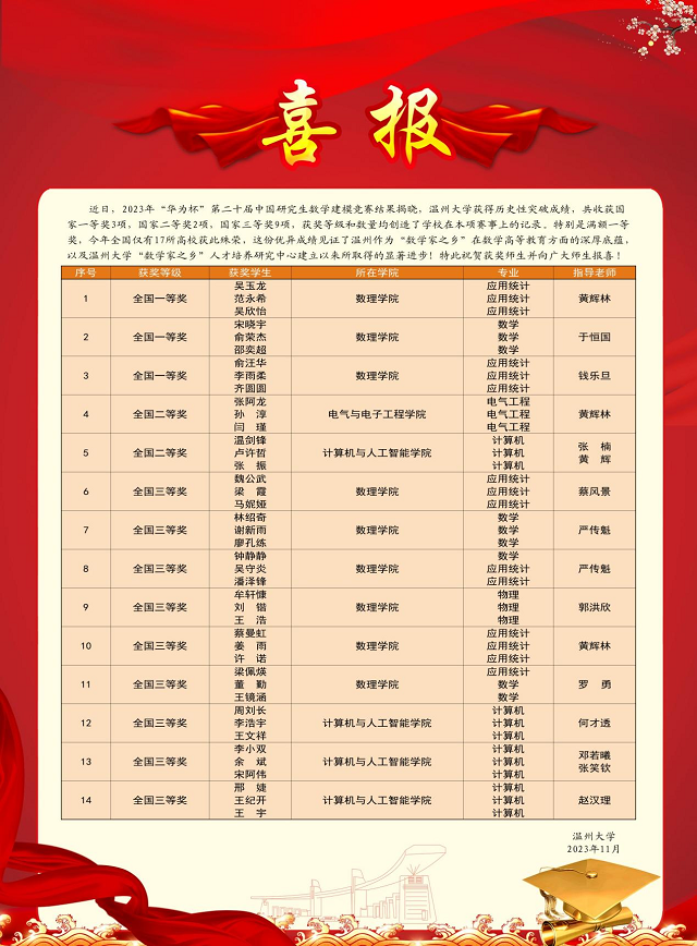 近日,2023年“华为杯”第二十届中国研究生数学建模竞赛结果揭晓。澳门银河官网 获历史性突破成绩,共收获国家一等奖3项(数理学院指导3项),国家二等奖2项(数理学院指导1项、计算机学院指导1项),国家三等奖9项(数理学院指导6项、计算机学院指导3项),获奖等级与数量均创造了澳门银河官网 在本项赛事上的记录。据悉,由于赛制规定,一个参赛澳门银河官网 最多只能获得3项国家一等奖,今年全国仅有17个高校获得满额。此次殊荣体现了温州作为“数学家之乡”在数学高等教育方面的深厚底蕴,见证了澳门银河官网 “数学家之乡”人才培养研究中心建立以来所取得的显著进步,也显示了澳门银河官网 近年来加强数学建模教学和培训团队建设的具体成果。