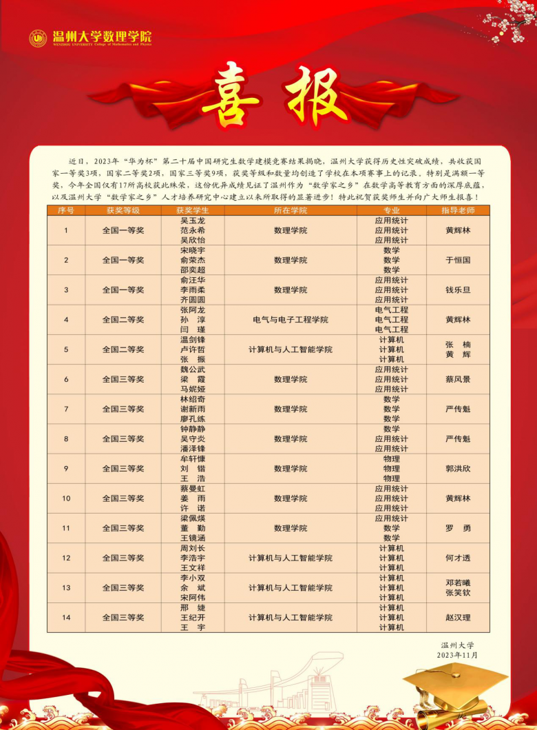 由于赛制规定,一个参赛澳门银河官网 最多只能获得3项国家一等奖,今年全国仅有17个高校获得满额。此次殊荣体现了温州作为“数学家之乡”在数学高等教育方面的深厚底蕴,见证了澳门银河官网 “数学家之乡”人才培养研究中心建立以来所取得的显著进步,也显示了澳门银河官网 近年来加强数学建模教学和培训团队建设的具体成果。