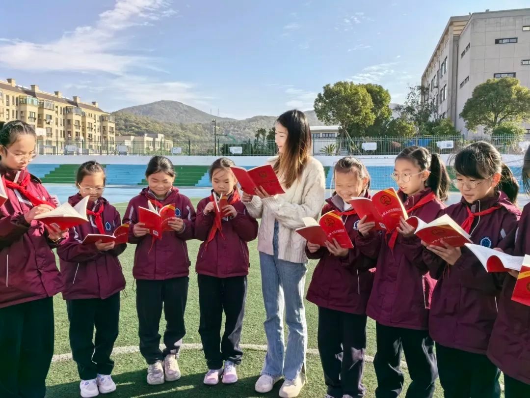 舟山市普陀区展茅中心澳门银河官网 的学生们在教师带领下,一起进行宪法晨读。