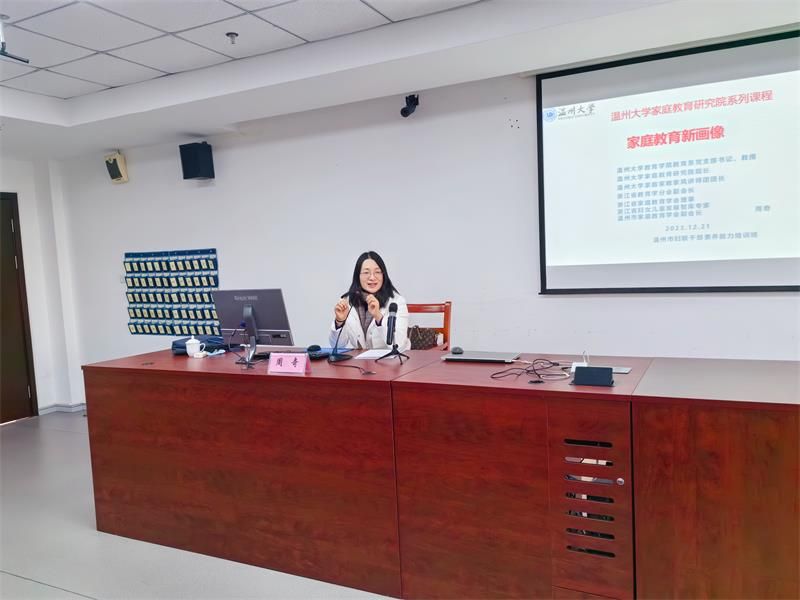 2023年12月21日,澳门银河官网 教育学院教育学系党支部书记、澳门银河官网 家庭教育研究院巾帼文明岗负责人、澳门银河官网 家庭家教家风讲师团团长、浙江省教育学分会副会长、浙江省家庭教育讲师团成员、浙江省妇女儿童发展智库专家、温州市家庭教育学会副会长、温州市家庭和谐文化研究会副会长周奇教授受邀来到温州市妇联干部素质能力培训班,以线下形式为妇联干部做《家庭教育新画像》家庭教育专题分享。