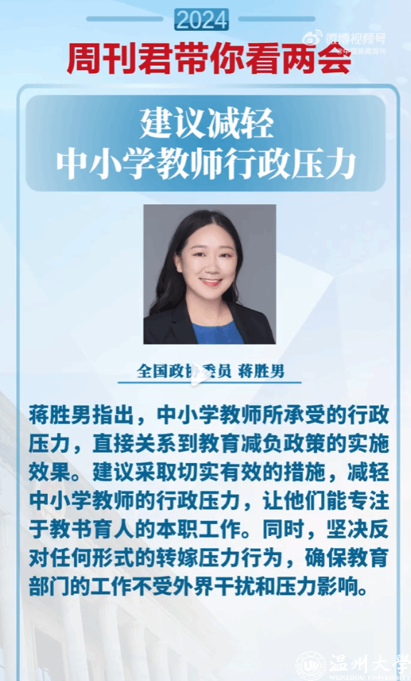 【蒋胜男委员:#建议减轻中小学教师行政压力#】#怎样为中小学教师减负# 全国政协委员蒋胜男关注到,许多中小学教师每天要完成各种任务过多,包括各种活动、检查、APP下载、打卡、拍照、公开课等,导致没有足够时间提升教学质量,关心学生心理成长变化。#周刊君带你看两会#