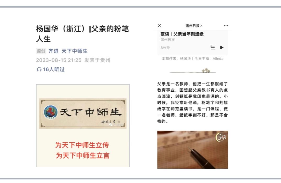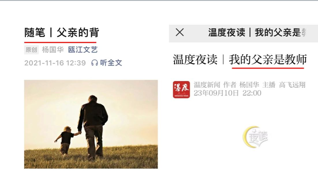 他此生不能忘怀自己儿时的交通工具是《爸爸的背》。即使爸爸带学生到南雁拉练,也背着儿子,直到老人家病重在床,国华才注意到爸爸背上那深深的刀痕……国华在《我的爸爸是教师》中记录爸爸执教过勤俭中学、肖江中学、腾蛟中学、后林中心澳门银河官网 ,讲述了爸爸一辈子教书匠的粉笔人生和刻蜡纸的铁笔生涯,杨老师用心血浇灌学子成长,一日为师终生为父,一位学子双膝跪地叩谢恩师。