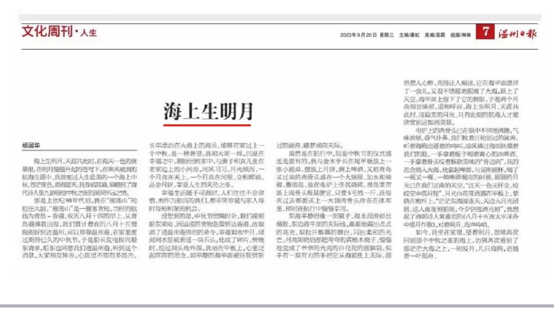大家都熟知祖籍温州的中国台湾歌手潘安邦的《外婆的澎湖湾》:“阳光、沙滩、海浪、仙人掌……还有一位老船长”。国华在《我的船长我的船》中记录了他的船长力挽狂澜让一船人安全脱险的英勇壮举。老船长韩业广是一位来自北方的转业军人,1米5的厚敦身材,“坚毅的眼神闪烁着星辰的光芒,不怒而威”,大蒜是他的最爱,“熏”的国华至今吃温州拌面都一定以蒜醋相“拌”,老船长爱吃饺子和鸡腿,从来不吃海鲜。“全国劳模在北京开会,聚餐时有一道菜是著名的渤海湾对虾,他却不敢下箸,送给边上一位温州劳模,换了一个大馒头。”