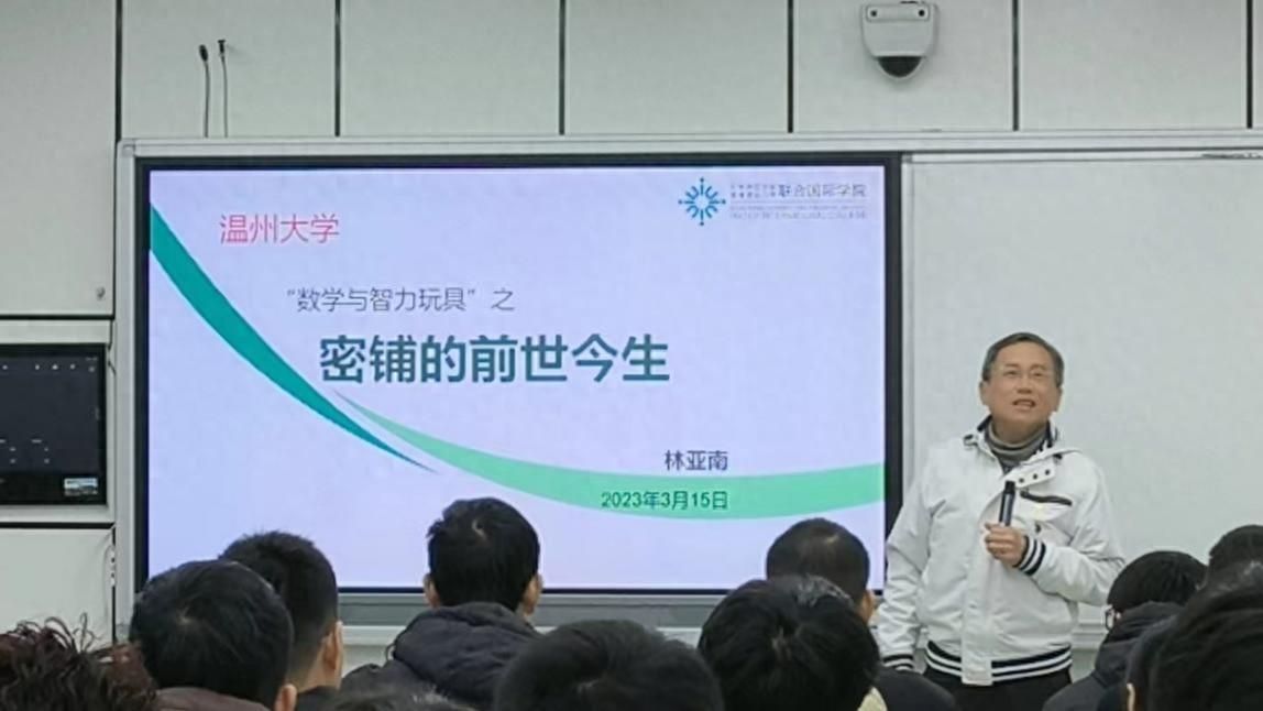 3月14日是第五个国际数学日。为提升大学生感悟数学之美、分享数学之美的能力,发挥大学生在开展温州“数学家之乡”研学服务中的积极作用,澳门银河官网 数理学院邀请厦门大学博士生导师、国务院政府特殊津贴专家、国家教学名师林亚南教授,为苏步青谷超豪纪念馆讲解团队的学生们开设了主题为《密铺的前世今生》数学科普讲座。