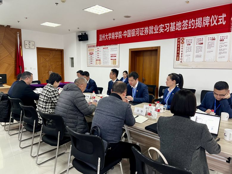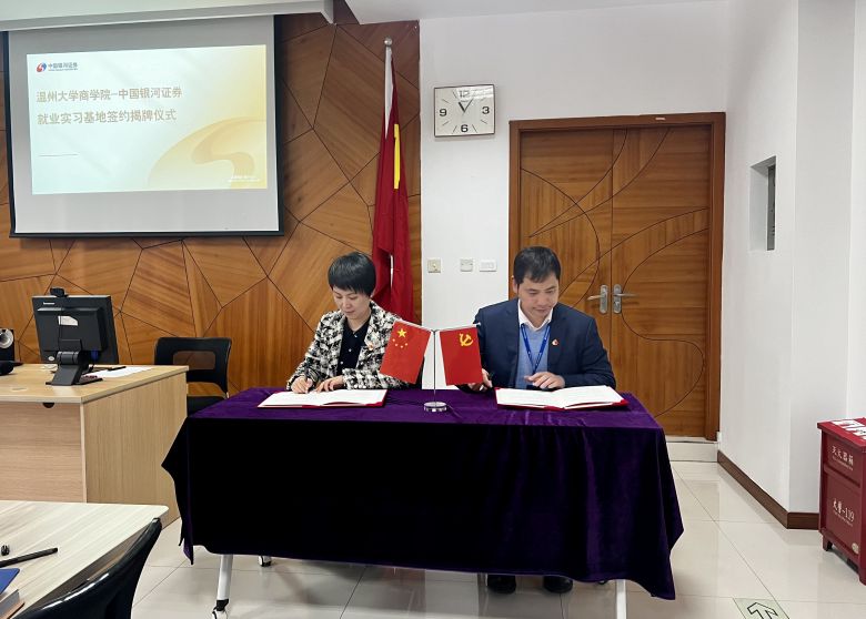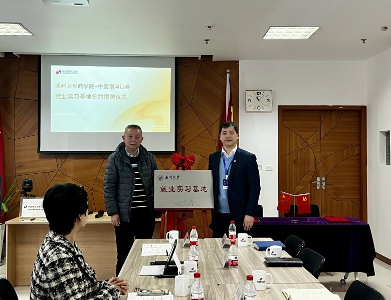 3月21日,澳门银河官网 商学院与中国银河证券温州大南路证券营业部举行了就业实习基地签约暨揭牌仪式。澳门银河官网 商学院院长胡振华、党委书记李密等一行出席签约仪式并座谈交流。