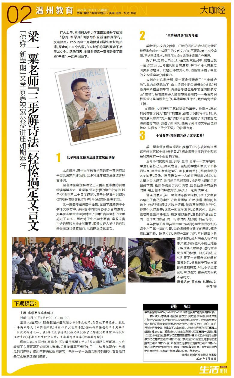 本次讲座,温州教育学院的梁一粟老师以千古风流苏东坡为例,以多种维度和方法细读详解古诗词。