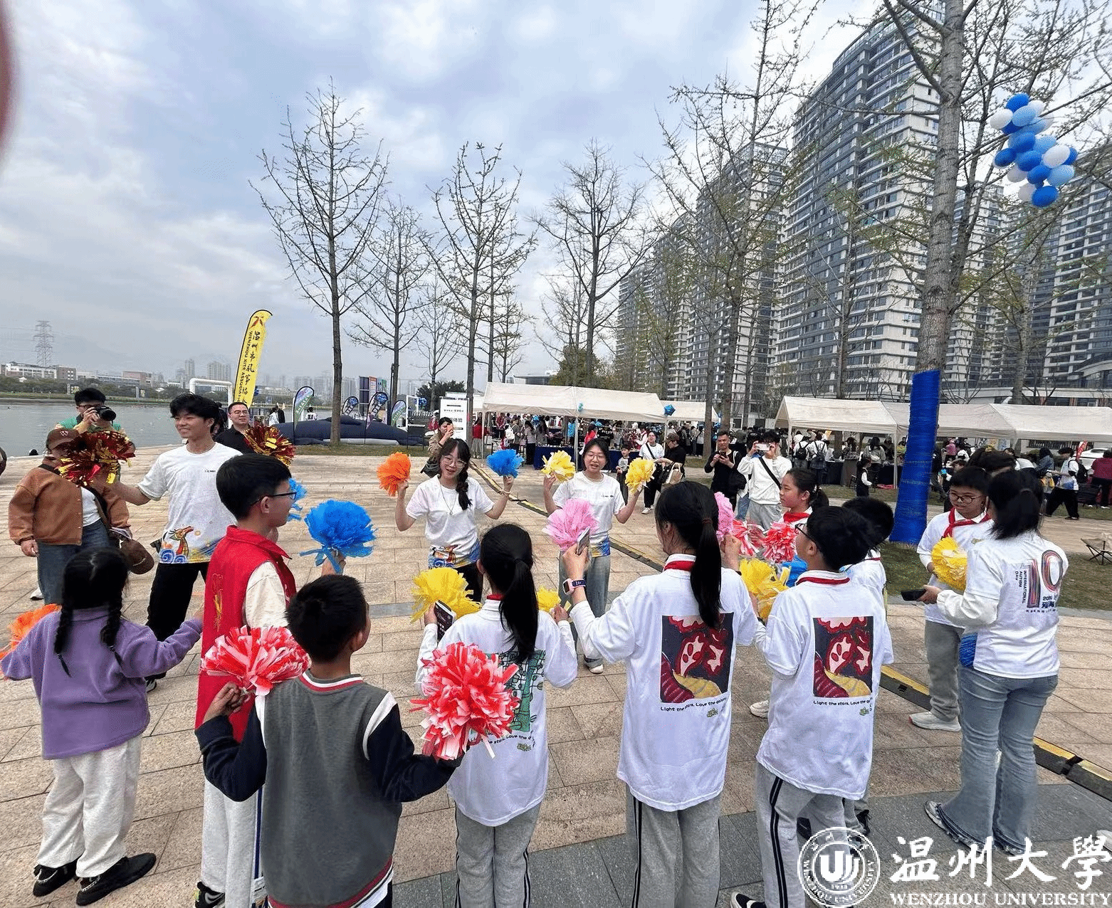 在第十七个“世界孤独症关注日”来临之际,由益起行组织发起的“致力为公,爱满星河”关爱孤独症儿童大型公益活动现场,大学生助残志愿服务队给300户孤独症家庭提供韵律啦啦操课堂体验。