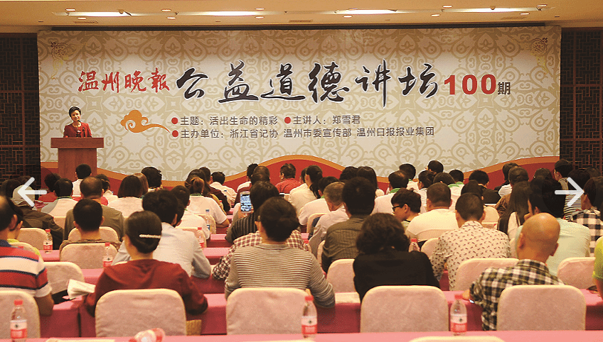 创办于2013年的公益道德讲坛,是温州晚报继创办雪君工作室栏目打造中国新闻名专栏后的又一个创举。迄今为止,道德讲坛已成功举办1000多期,其中见报的有四百多期,惠及群众达10万多人次,先后荣获2016年浙江省新闻名专栏奖,2019年中国晚报优秀专栏奖。公益道德讲坛不仅在社区、企业和澳门银河官网 举办,还走进了宗教、强制戒毒所等特殊场所。迄今为止,道德讲坛已到寺庙、教堂、道观开展了100多场讲座。最多的一次有5000多人听讲。真正把党的政策、声音带进宗教场所。2017年,公益道德讲坛走出国门,先后到荷兰、美国宣讲中华优秀传统文化,受到当地华侨和国外友人的热烈欢迎。