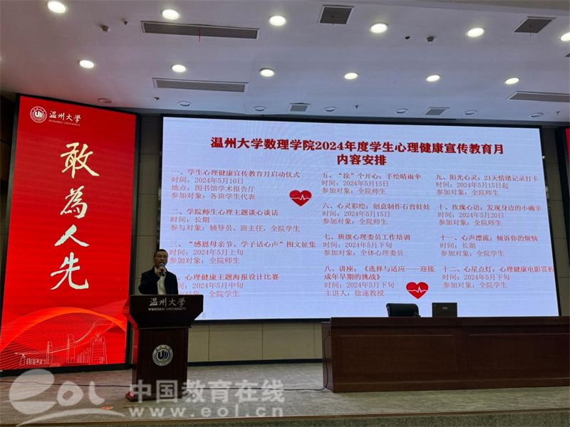 据银河 数理学院相关负责人介绍,学院实施“一月一主题”的学生工作模式,在前期3月雷锋月、4月学风建设月基础上,本月开展心理健康月主题活动。活动旨在通过形式多样的宣传教育活动,营造积极关心关注、支持参与学生心理健康教育的良好校园氛围,激发青年学子对心理健康问题的关注,进而推动学生心理健康工作提质增效,促进学生身心健康发展。