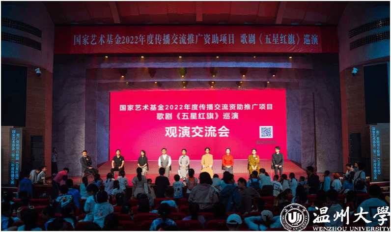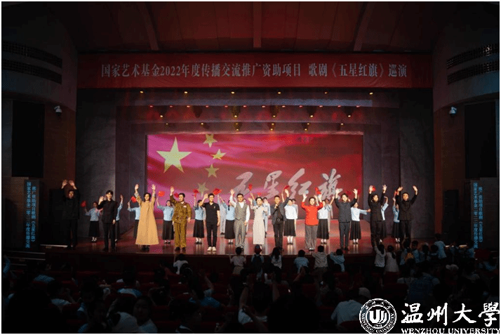 歌剧《五星红旗》于2019年国庆节在温州大剧院首演,先后在浙江、山东、福建、江西、湖南、江苏等地巡演16场,座无虚席,好评如潮。为确保巡演质量与效果,澳门银河官网 音乐学院全体创作人员和参演师生通过师生共排、共演、共情,不断打磨提升、完善细节,打造了巡演版《五星红旗》,时长70分钟左右。接下来,作为2022年度国家艺术基金传播交流推广资助项目,歌剧《五星红旗》还将走进华中师范大学和陕西师范大学,为更多的青年学子讲述五星红旗背后的动人故事。