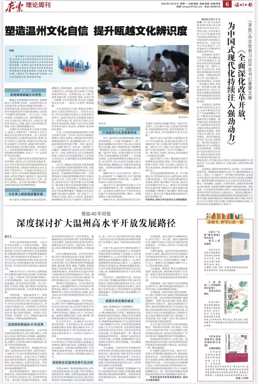 如今,温州的文化探索和挖掘之路还在持续推进——打造“宋韵瓯风十二章”,推进宋韵瓯风文化传世工程;深入开展戏曲文化挖掘、保护、传承和弘扬,不断擦亮“南戏故里”金名片;以深化《温州大典》编纂、“温州学”研究、永嘉学派研究为主体内容,打造宋韵瓯风文化谱系……文化融合创新,让温州故事搭载文化精品走向全国、走向世界,也让文化的力量融入温州的经济动脉,赋能地方产业提升和高质量发展。这样的成功案例,在瓯越大地上屡屡上演。