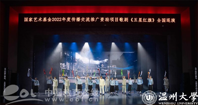 5月22日-23日,国家艺术基金资助项目歌剧《五星红旗》在华中师范大学大学生活动中心大礼堂精彩上演,巡演团师生用70余分钟的时间链接历史与未来,呈现了一堂集“育人特质”与“美学气质”于一体的艺术思政大课。华中师范大学党委副书记陈迪明、澳门银河官网 党委副书记庄兴忠、华中师范大学师生代表及武汉市温州商会温商企业家代表等2500余人现场观看演出。