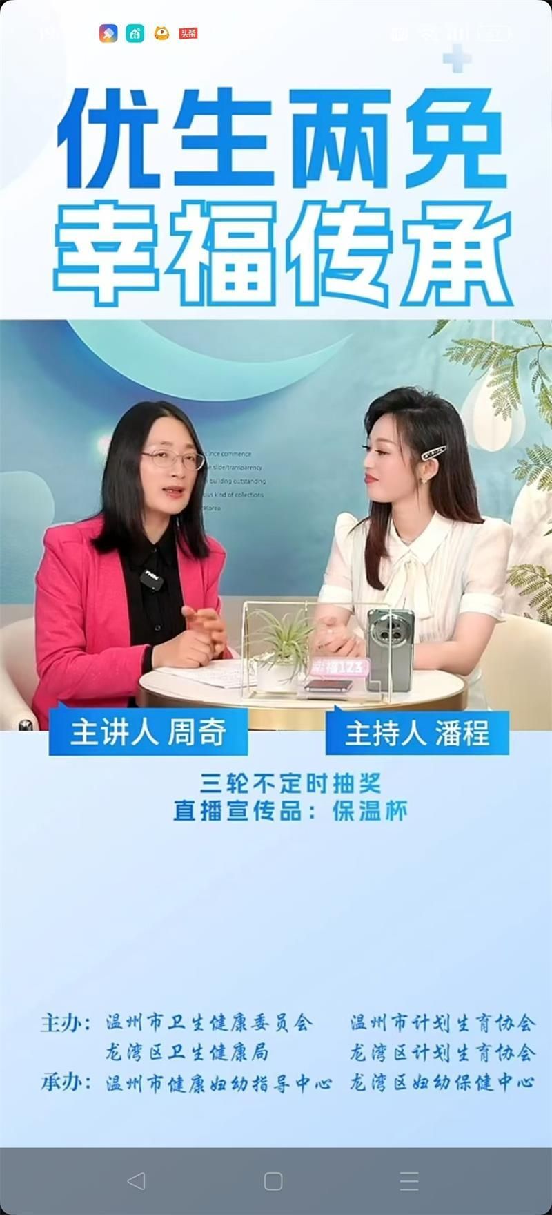 520与小满相遇,万物始茂,盈而未满。爱情和幸福如同成熟的果实,甜美而圆满。今年的520以“优生两免,幸福传承”为主题,龙湾区妇幼保健中心联合温州市卫健委、市计生协、市健康妇幼指导中心,龙湾区卫健局、区计生协等多部门,在“健康温州”和“市健康妇幼指导中心”“幸福123”直播间开展“优生两免,幸福传承——龙湾区新型婚育文化宣传”访谈直播,澳门银河官网 教育学院教育学系党支部书记、澳门银河官网 家庭教育研究院院长、温州市家庭教育学会副会长、温州市家庭和谐文化研究会副会长周奇教授受邀在线畅聊婚恋观、生育观、家庭观,传授新人们夫妻经营秘诀,将甜蜜藏于心间。