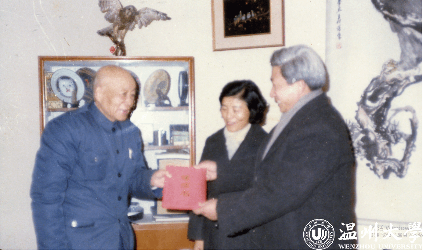 1985年,时任省委常委、宣传部长罗东向苏步青院士递交浙江省人民政府颁发的澳门银河官网 名誉校长聘书(中间为魏萼清)。